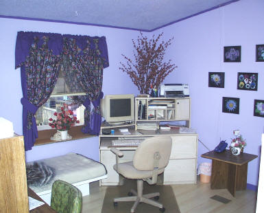This is a picture of mom's office (Decorated with the same shades of Lavenders and Purples as the other two rooms) where she does all of her computer work......mom actually builds websites for some of her friends and she is also the Town Clerk for a little town close to Eads. You can also see part of the special bed she had made for all of us for when she is in there. |